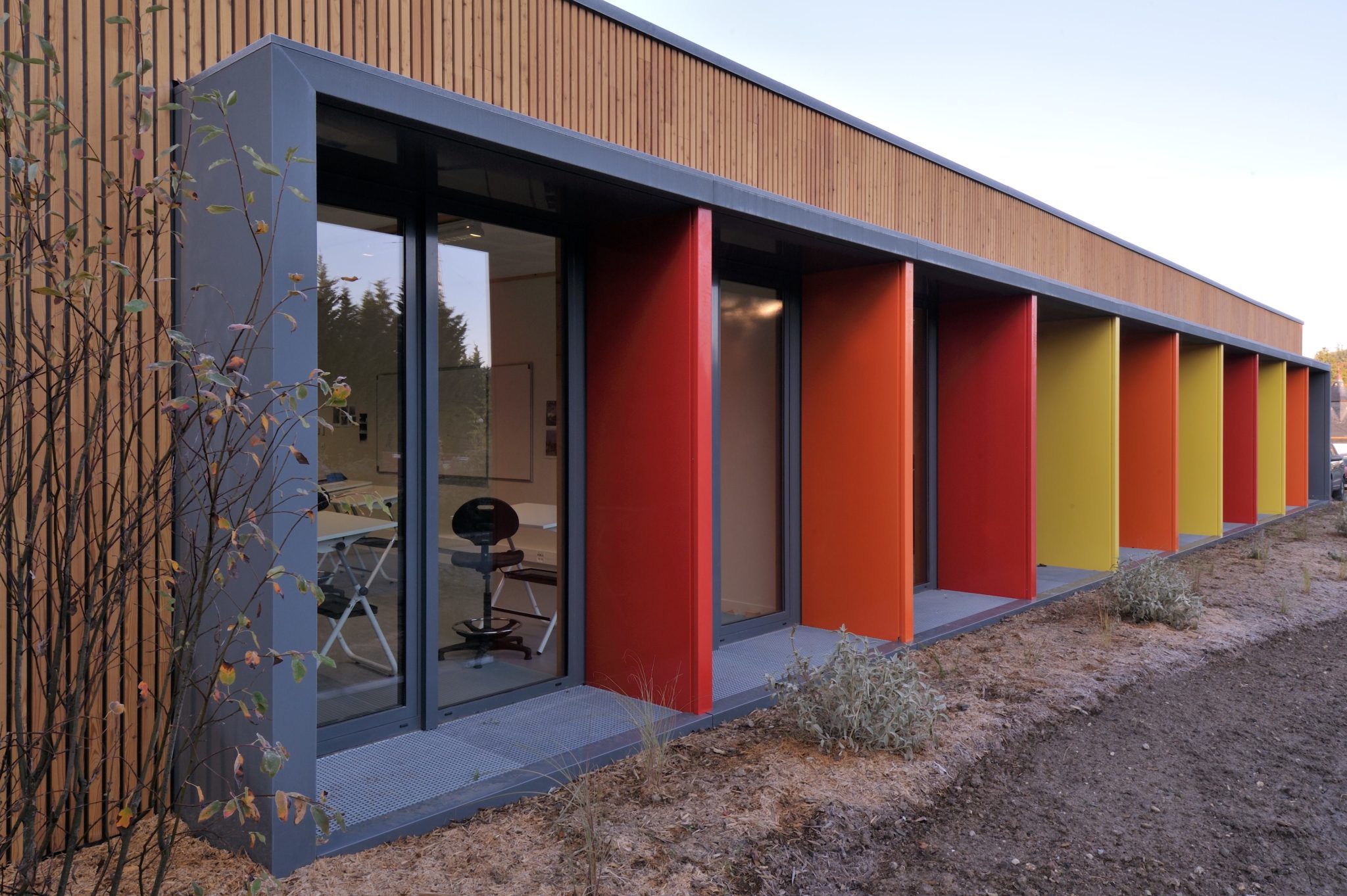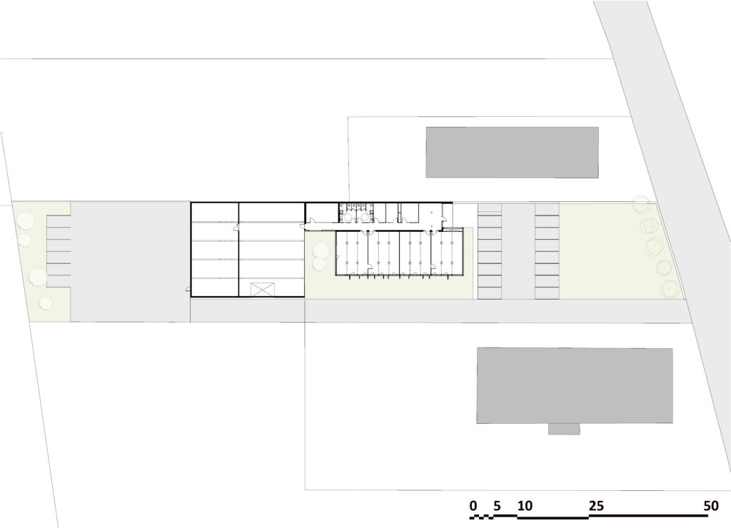 Cette construction neuve se compose de deux entités. La première regroupe les espaces de services et une distribution linéaire (entrée, accès au hangar, aux salles de classe…). Totalement fermée sur la mitoyenneté (mur en parpaings d’aggloméré de béton et bardage coupe feu), elle s’ouvre largement sur le pignon d’entrée et l’intérieur de la parcelle avec des parois en polycarbonate translucide. La seconde entité accueille quatre salles de formation pour les cours théoriques. Beaucoup plus basse, elle vient se greffer sur la première entité créant ainsi un joint creux avec le hangar existant dont la façade sera retraitée avec de larges baies verticales. Cet espace extérieur sera aménagé en cour arborée, en relation directe avec la distribution. Elle se trouve au cœur du bâti.